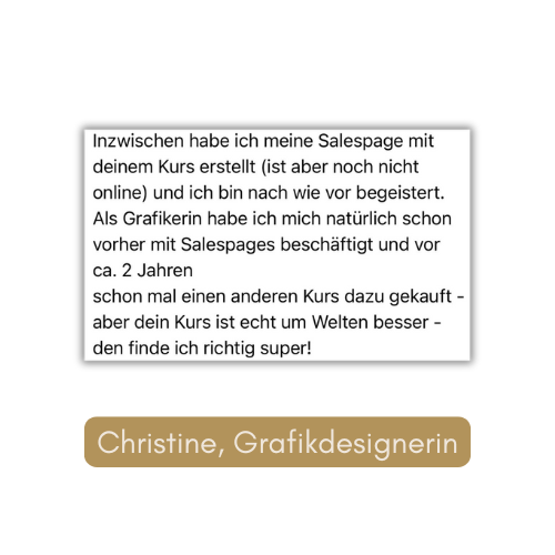 Der Kurs wurde alleine in der Testphase von über 10 Unternehmerinnen auf Herz und Nieren geprüft. Das Ergebnis? Die Salespage Texte waren innerhalb von 30 Minuten fertig und konnten direkt eingepflegt werden. Normalerweise sitzt du an guten Salespage Texten 4-8 Stunden.