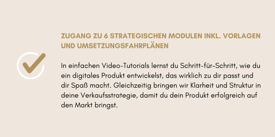 Nach diesem Modul: Weißt du, wie du Schritt für Schritt vorgehst, was wann wichtig ist – und bist bereit für die Umsetzung von deinem digitalen Produkt. -