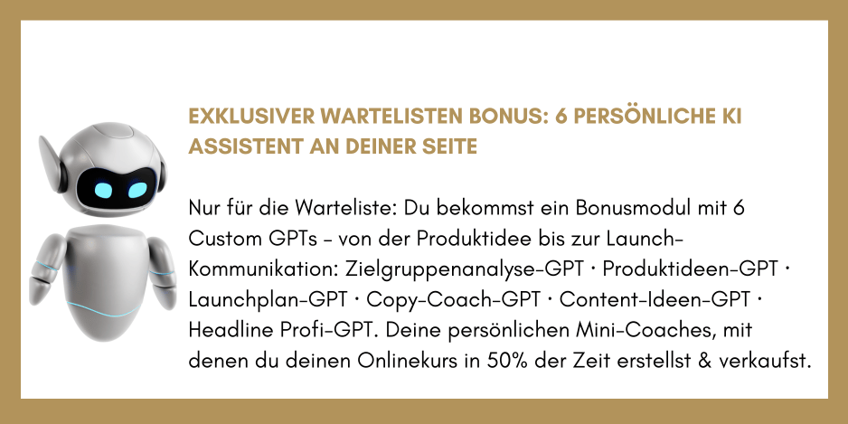 6 smarte GPTs (Copy Coach, Headline-Profi, Launchplanerin, Produktideen-Profi, Zielgruppen-Expertin & Content-Strategin), die dir helfen, deinen Kurs in der Hälfte der Zeit zu erstellen. [Wert: € 1.200]